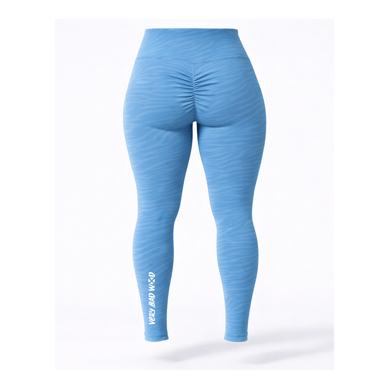 Legging femme entraînement taille haute sculptant MARBLE bleu avec l'inscription VERY BAD WOD sur jambe gauche à l'arrière et sur le haut droit en rond et blanc, sur l'avant.