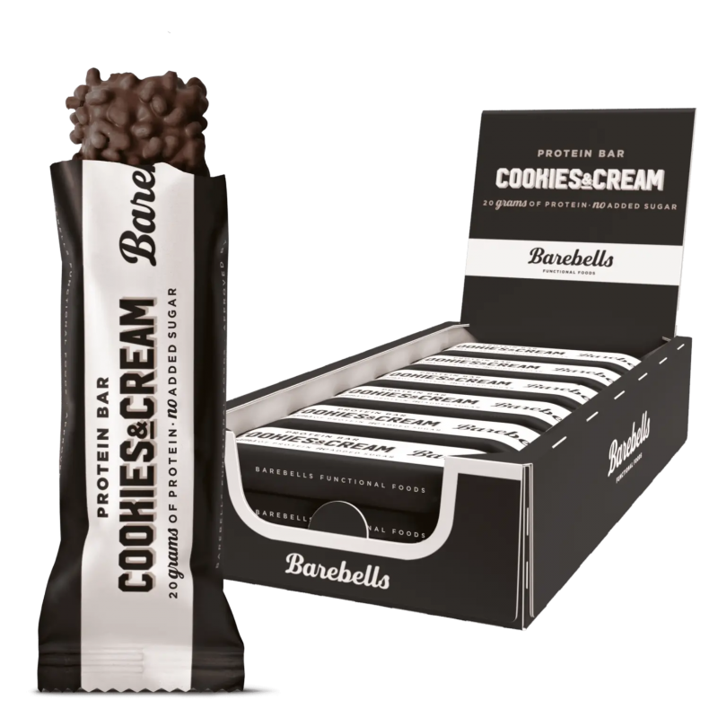 Le pack de 12 Barres protéinées naturelles et savoureuses BAREBELLS (12x55 gr), saveur COOKIES ET CRÈME.