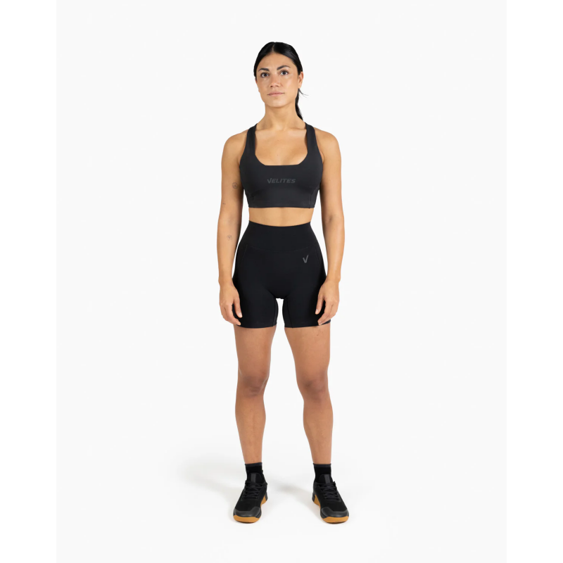 Minimalist in look, maximalist in function - the VELITES HOLO Low Neck sports bra in black is built for those who move with purpose. Whether you're grinding through CrossFit®, tackling a Hyrox workout, or flowing through yoga, this bra delivers reliable medium support in a discreet, powerful style.